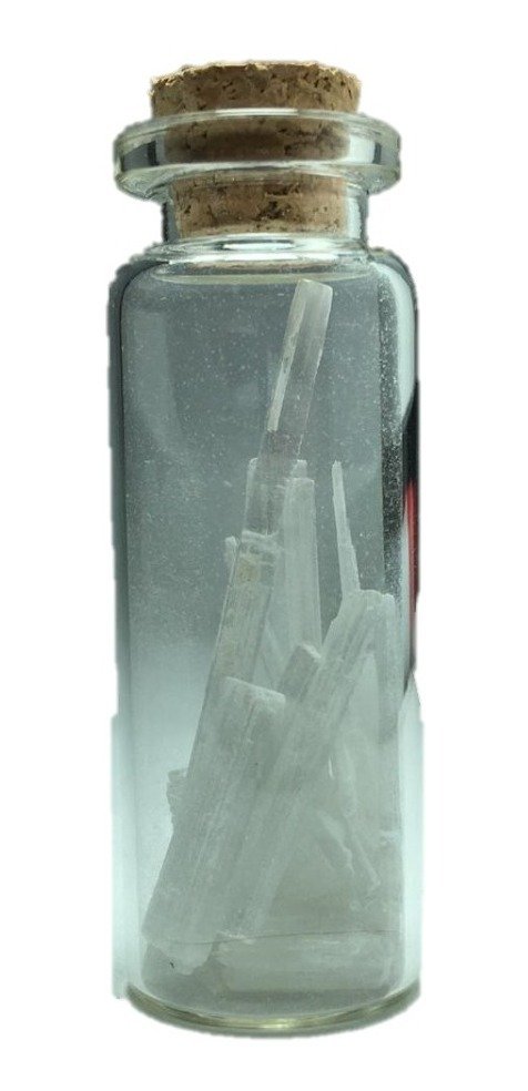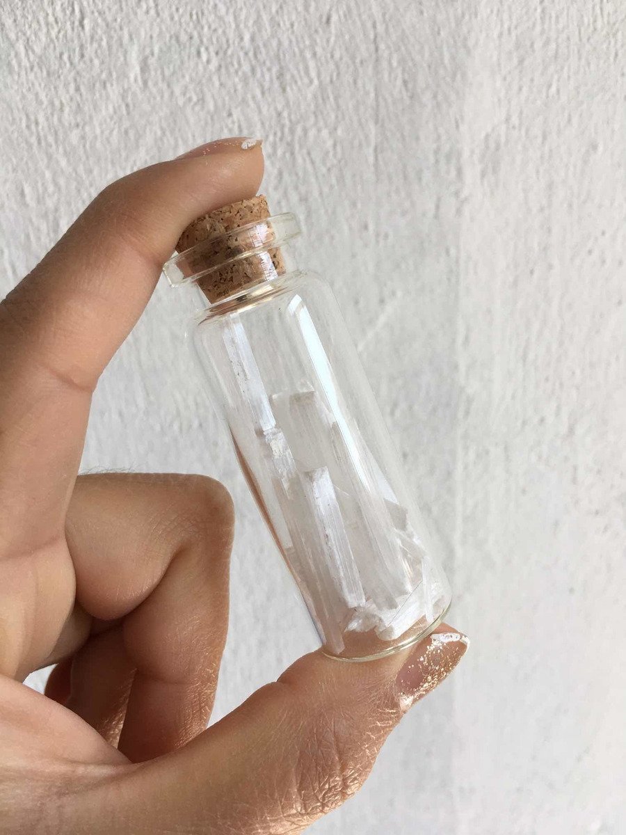 SOBRE EL PRODUCTO: Botellita de cristal con Selenita. Las dimensiones de la botellita son 6x2x2 cm aproximadamente. OJO: La botellita no está completamente llena y contiene Selenita de diversos tamaños. Es una pieza excelente de decoración, como colección o amuleto.