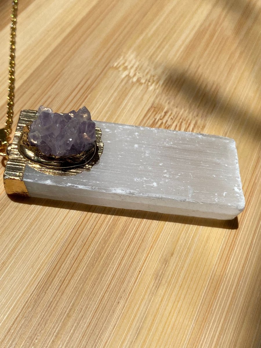 Perfecto tanto para uso diario como para momentos especiales, este dije no solo es una joya, sino también un amuleto que acompaña el bienestar personal. La combinación de selenita y amatista en este modelo destaca la armonía y la paz interior, convirtiéndolo en un accesorio imprescindible para quienes valoran la espiritualidad y la moda. Empodera tu estilo con esta joya que evoca tranquilidad y cuidado personal.