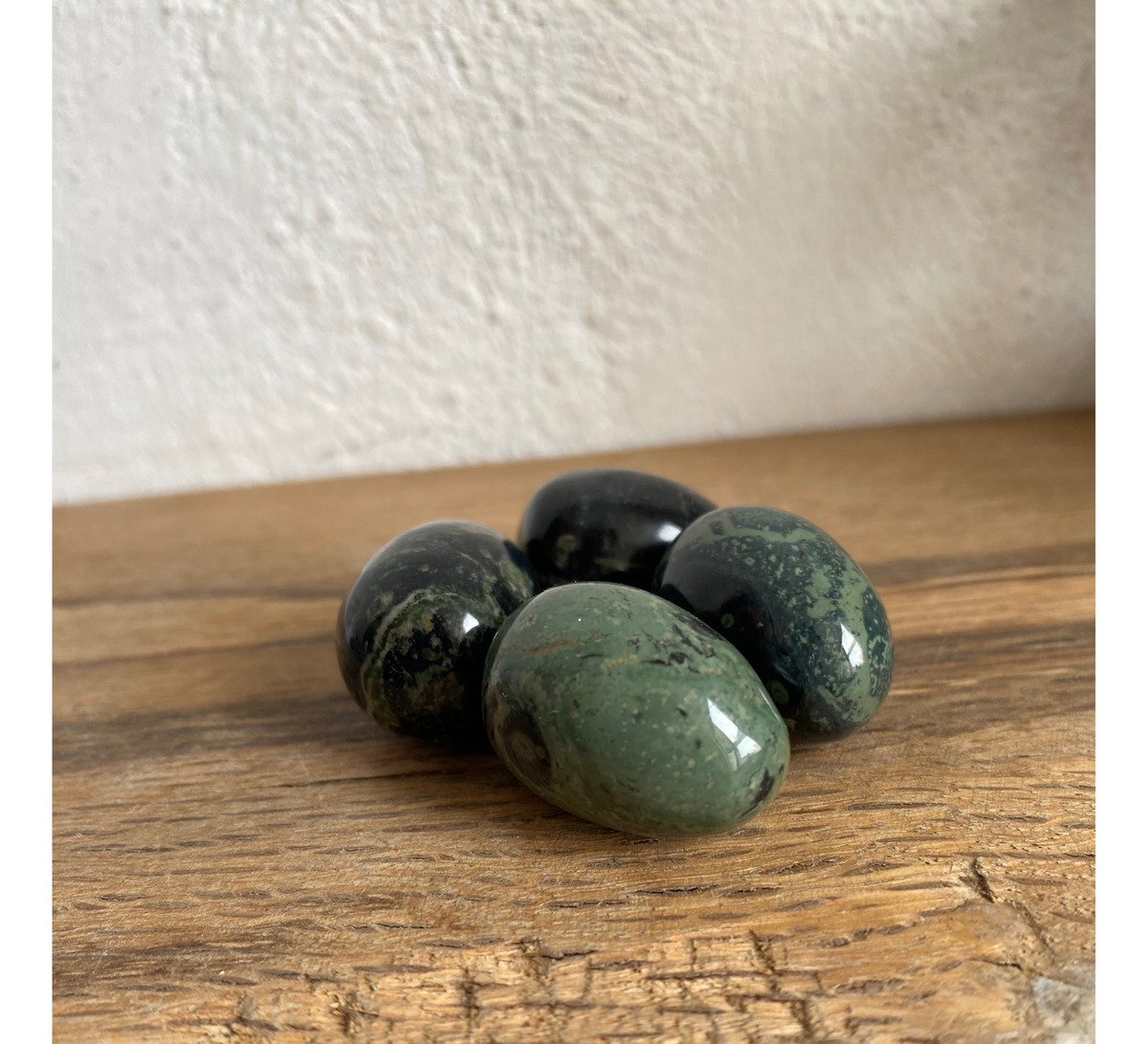 Se dice que el jaspe kambaba es una piedra profundamente enraizante, que te armoniza con los ciclos del mundo natural, puede ayudarnos a poner los pies en la tierra, especialmente a personas demasiado fantasiosas, Los minerales verdes tienen un efecto armonizador y neutralizador. El verde libera los sentimientos, aumentan la rapidez y capacidad de reacción y despiertan intereses y entusiasmo.