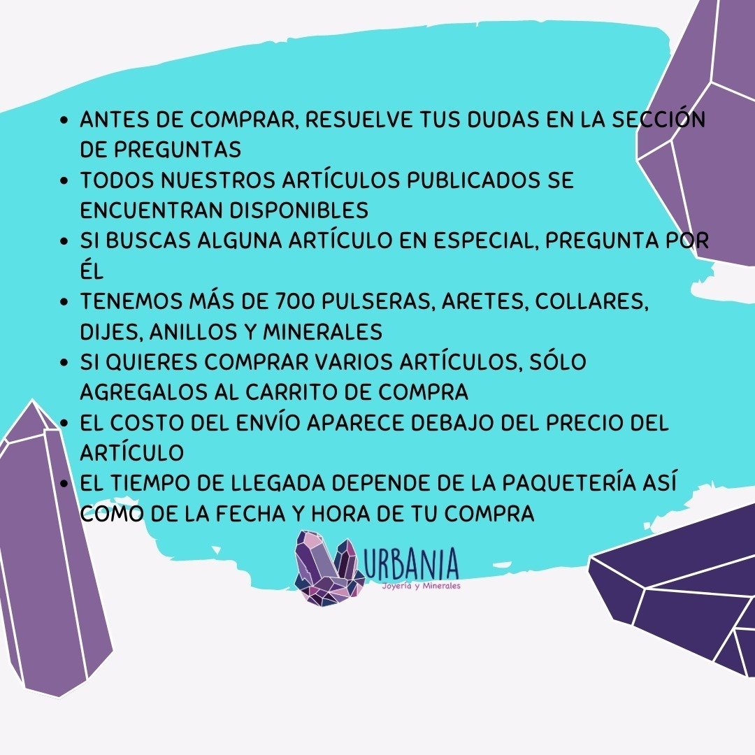SOBRE NOSOTROS: Somos URBANIA JOYERÍA Y MINERALES y nos dedicamos a la joyería y venta de minerales, piedras y piezas ornamentales y de colección. Te invitamos a visitar nuestros demás productos. TENEMOS MÁS DE 1000 ARTÍCULOS EN EXISTENCIA.