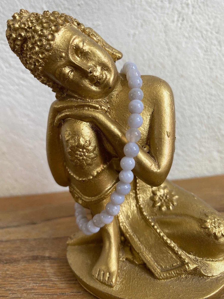 Las propiedades curativas del ágata azul son especialmente beneficiosas para la salud de la garganta, el cuello y los hombros. Ayudando tanto a aliviar dolencias físicas en las zonas superiores del cuerpo, como a potenciar la capacidad de expresión y las herramientas de comunicación.