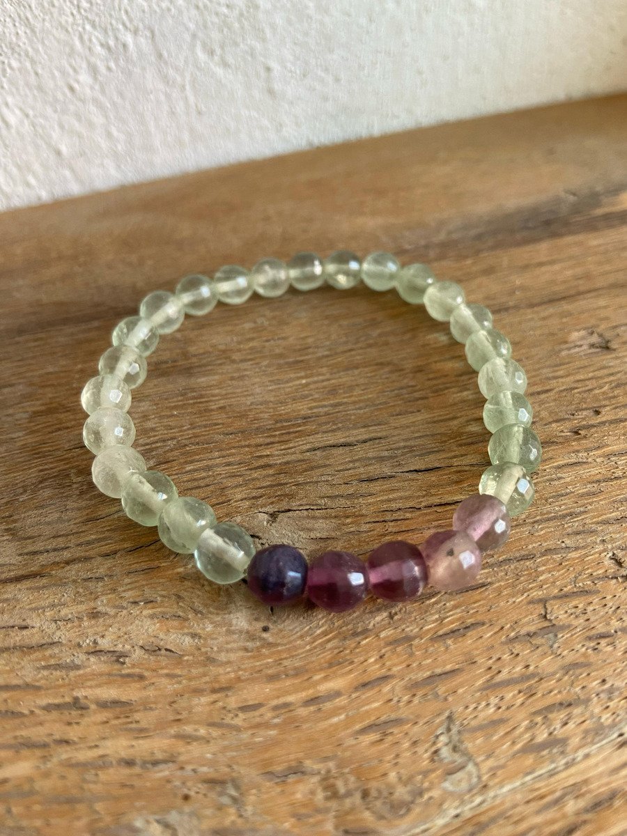 La pulsera de fluorita verde y morada con esferas facetadas de 6 mm es una pieza única que combina elegancia y estilo. Su diseño atractivo y su acabado en piedra natural la convierten en un accesorio ideal para cualquier ocasión, ya sea para un evento formal o para el uso diario. La fluorita es conocida por sus propiedades energéticas, lo que la hace no solo un complemento estético, sino también un amuleto de bienestar.