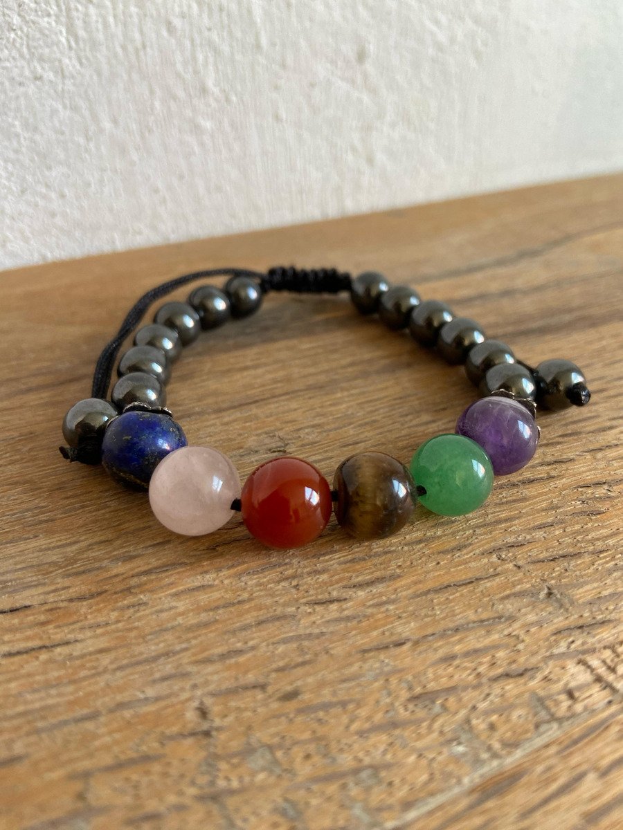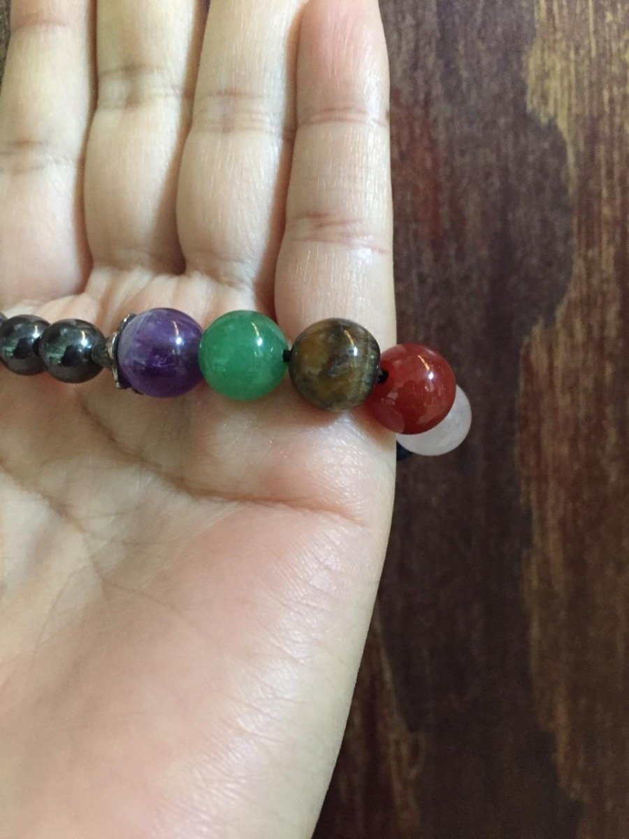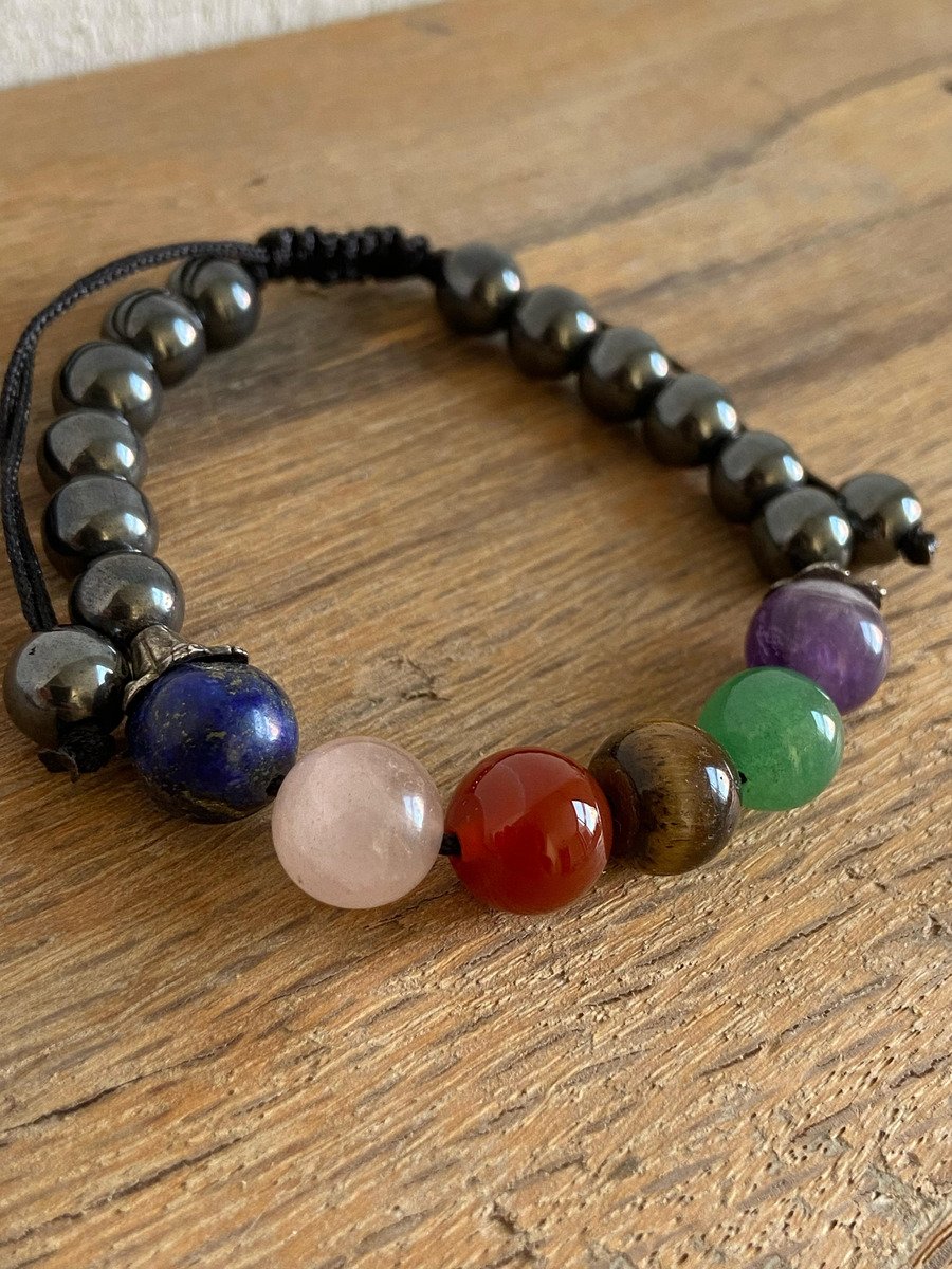 >>Pulsera hecha con hematita, amatista, aventurina, ojo de tigre, ágata cornalina, cuarzo rosa y lapislázuli